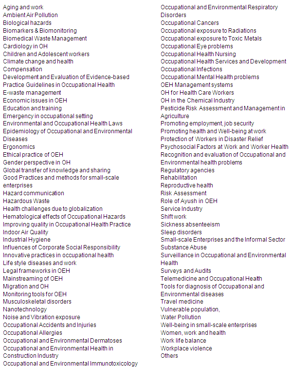 The theme of the ICOEH 2014 is Mainstreaming of Occupational & Environmental Health. Most of the occupational and environmental diseases are being missed out in the differential diagnosis in the present health care system due to marginalization of the Occupational and Environmental health issues. However the burden of these preventable Occupational and Environmental diseases is much more than being perceived by all the stakeholders, and all the burden of the treatment of these otherwise non-treatable Occupational and Environmental Diseases has to be borne by the already crippled health care system of a country. Much of the national resources are being wasted as compare to cost - effective preventive solutions at various levels.To deliberate on Mainstreaming of Occupational and Environmental health issues, we propose the following sub-themes to be covered in two and half days of the brainstorming sessions: